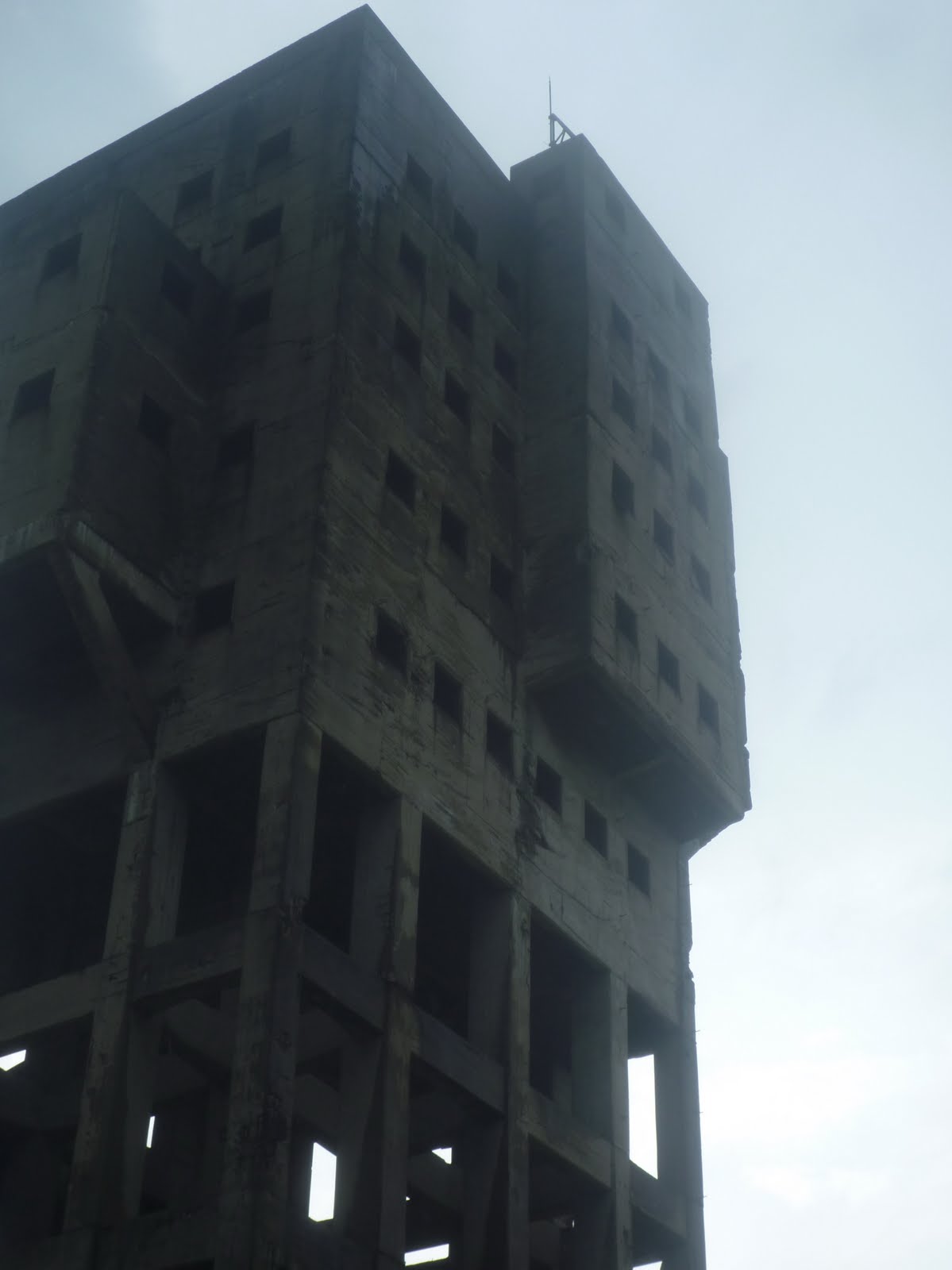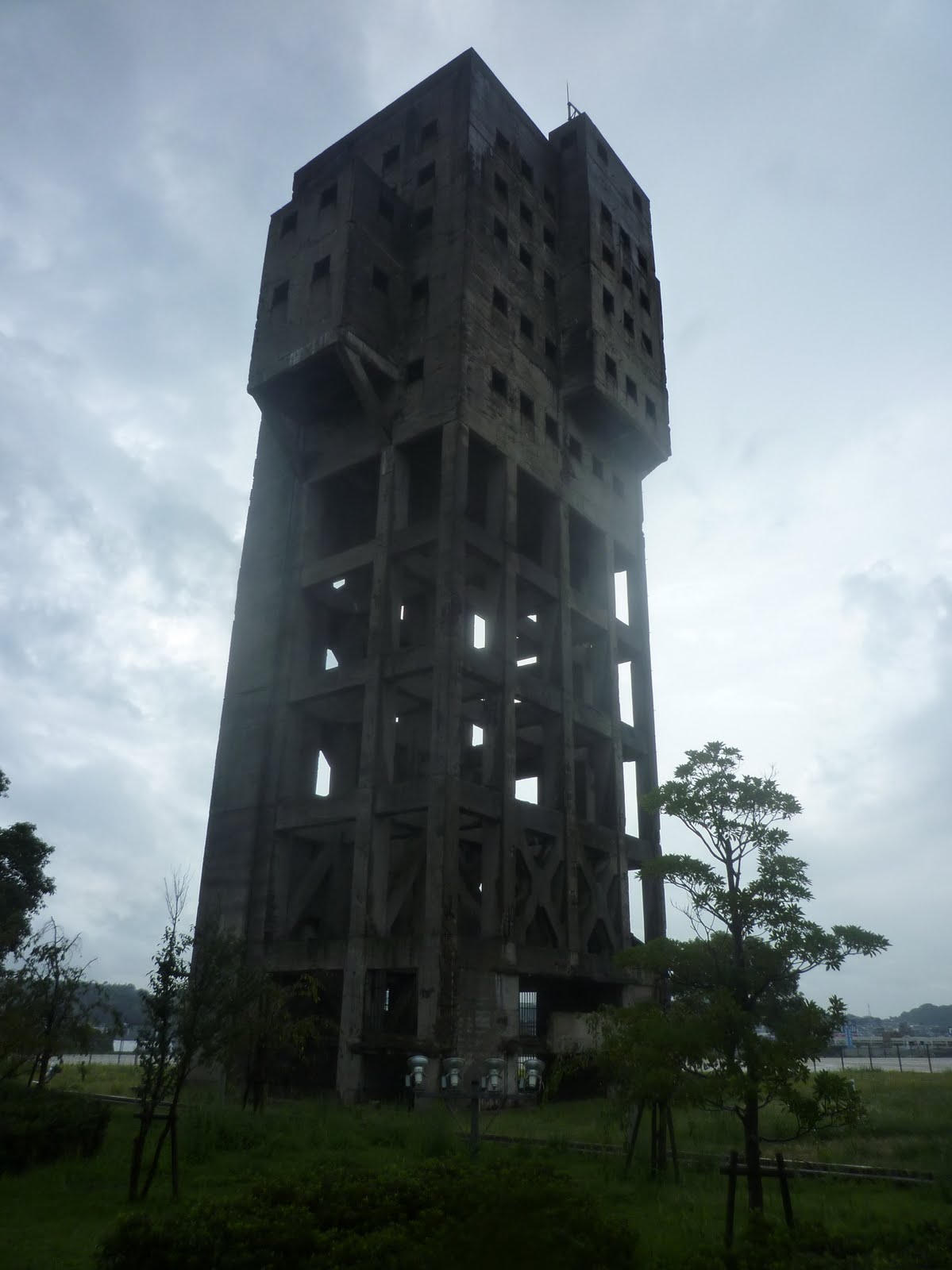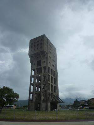 The Shime mine began operations in the late 19th century, though the above structure (which is really all that is left above ground) was built during the war when the mine was used to supply coal to the Japanese Navy. It is a well-documented fact that a lot of coal mines in Fukuoka employed Allied POWs during the war in some really atrocious conditions. None of the signs which gave the building's history gave any hint of whether that was the case at Shime mine as well, though the time of its construction (1943) and its use by the Navy make me suspect it may have been.At any rate, I have to admit that the building has an odd charm about it. Something about its odd shape, it looks different from different angles: